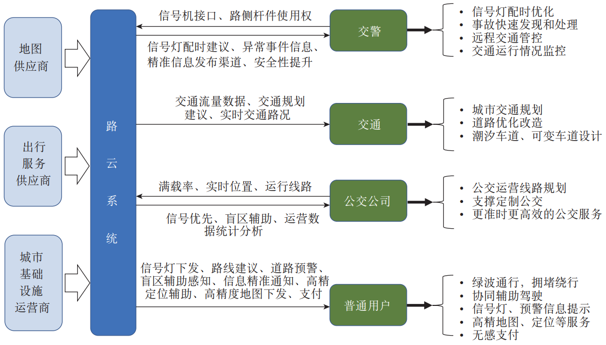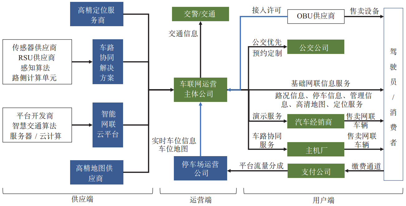 在智慧城市场景下,车联网可以为各方使用主体提供多种形态的服务模式,满足多种需求。对于交通主管部门,车联网系统通过信号灯配时优化、绿波通行等场景应用,有效提高城市交通效率;通过超速预警、闯红灯预警、盲区预警等场景应用,提升交通安全;通过事故识别、异常行为上报、特殊车辆优先通行等场景应用,提升交通管理精度。对于交通规划部门,车联网系统汇聚的道路运行数据、车辆轨迹数据等数据资源,能为城市交通规划决策提供大数据支撑,进而科学地开展道路改扩建、车道管理、新建道路规划。对于城市公交企业,车联网系统通过信号灯配时策略建议,实现公交优先,提升公交车的运行效率;通过共享感知、盲区预警等场景应用提升公交车运行安全性;通过平台优化,精准调度公交车辆,动态优化调整发车频率甚至运行路线,实现交通运输资源的灵活配置,打造精准公交、定制公交。对于个人用户,车联网系统通过信号灯信息下发、路径建议等场景应用,支撑绿波通行、自适应巡航控制等功能;通过感知信息共享、盲区预警等场景应用,支撑碰撞警告、自动紧急制动等功能;通过高精度定位、高精地图下发等场景应用,支撑自动驾驶等功能;通过近场支付等场景应用,支撑停车无感支付等功能。在商业模式方面,城市场景下的车联网生态包括供应端、运营端和用户端,价值链条顺次展开。其中,供应端方面,企业围绕城市车联网系统建设,提供路侧设施、云控平台、高精定位、高清地图、车载终端等设备和服务,获取商业回报。运营端方面,城市车联网基础设施运营主体为各类用户提供多形态服务,获取服务回报;停车场等关联主体通过平台引流获取停车收益。用户端方面,主机厂通过车联网功能获取车辆溢价;公交企业通过提升公交运行效率提升服务水平。智慧城市场景下的车联网价值链条如图3所示。