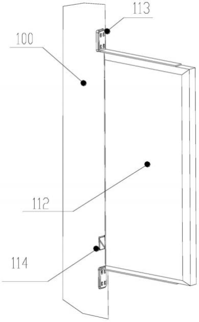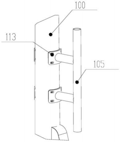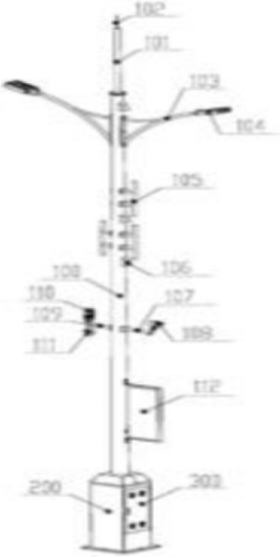 [0030] 如图1-8所示的一种5G通信基站一体化综合杆,包括杆体100和箱体200,杆体100 固定于箱体200上,箱体200固定于地面上;还包括天线抱杆101、照明灯具104、锚点天线、摄 像装置和信息发布屏112,天线抱杆101、照明灯具104、锚点天线、摄像装置、信息发布屏112 均固定于杆体100上。