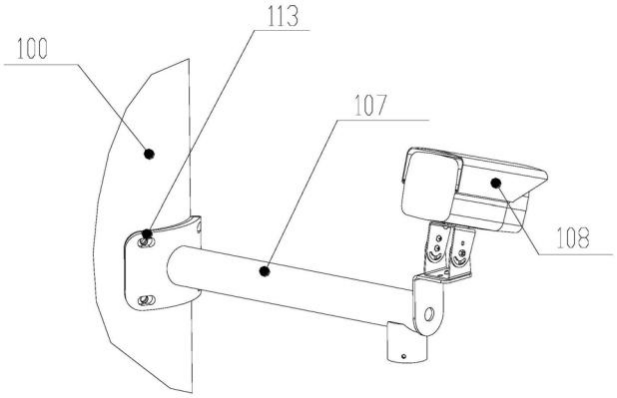 [0038] 另外,摄像装置通过摄像连接臂固定在杆体100上,摄像连接臂通过连接螺栓113 固定于杆体100上,环境监测装置110通过连接螺栓113固定在摄像连接臂上,其中,环境监 测装置110上的连接螺栓113为U型螺栓,即环境监测装置110通过U型螺栓固定在摄像连接臂上。