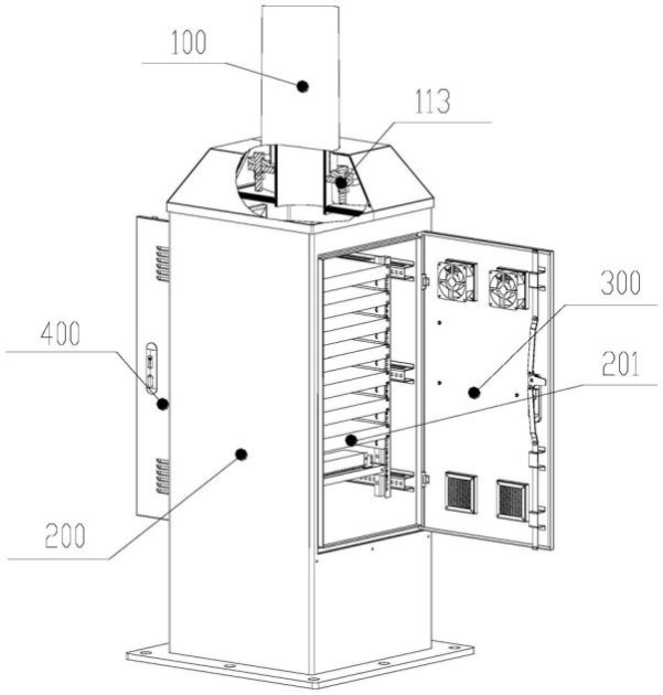 [0033] 需要强调的是,箱体200上设有前门组件300和后门组件400,能够对箱体200内部腔室进行打开或者关闭。箱体200内部腔室中容置有通信设备201,以便实现通信功能。