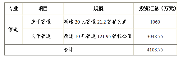 新建管道143.15管程公里,合计1713.5管孔公里,按2.5万元/管孔公里计列,投资4108.75万元。
